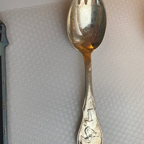 Skøn gammel Ole Lukøje ske og 2 ens haves på 15.2 cm i flot stand og særdeles smukt udført - 1 med privat inskription på bagsiden til KUN 99,- og 1 uden til 129,- Begge er sølvplet