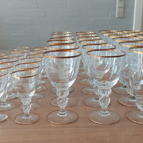 Prisen for 5 stk. Snapseglas, Mågestel, med guldkant. Ingen skår og ikke vasket i opvaskemaskine.