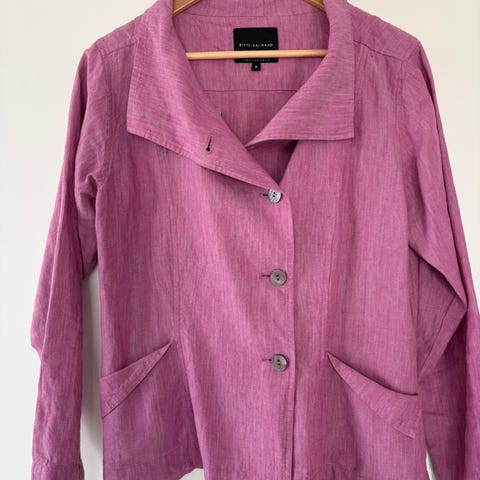 Jakke, str. 38, Bitte Kai Rand, Sort, Hør, Næsten som ny, Smart, enkel kort indejakke i sort hør. Med stolpelukning med knapper. Påsat lomme på hvert forstykke. Indvendig smart effekt med ternet skråbåndbesætning. Lange ærmer med ombuk. Ekstra knap medfølger. Fra røg- og dyrefrit hjem og fra hjem uden parfumestoffer.