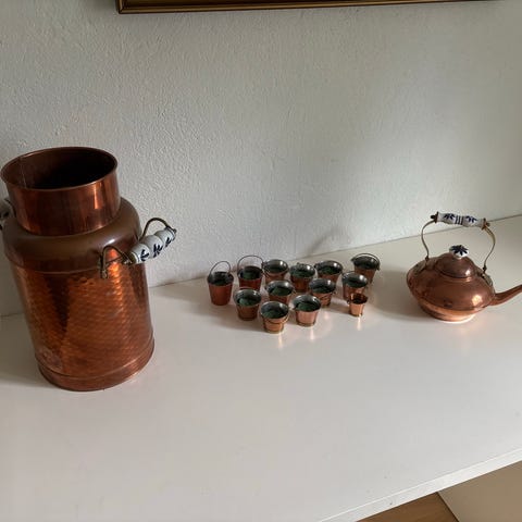 Kobber sukker og flødesæt, Ukendt, Sød gave til kobberbryllup eller anden brug.