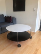 Rimadesio rullebord med rundt design, hvid bordplade og sort hylde under. Bordet har hjul for nem mobilitet og en metalramme.