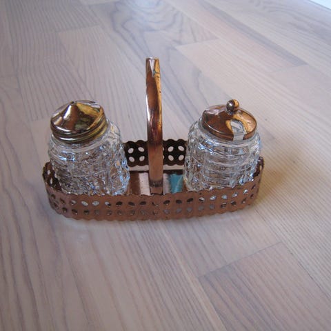 salt og pebersæt, ukendt, Charmerende salt og peber bøsse på en fin lille bakke