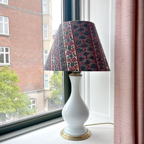 Smuk retro bordlampe i bruneret metal med hvid opaline glasskærm. H 43 cm, dia glasskærm 23 cm. Virker perfekt. Skærmholder skal svejses fast og prisen er sat derefter
