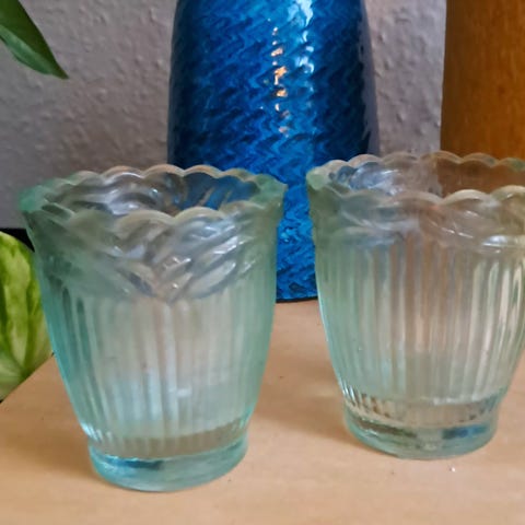 Fyrfadsstager, To fyrfadsstager i grønt glas. De er kvadratiske og med kvadratisk mønster. De er grønne nuancer, lyse og mørke.