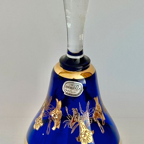 5 - to små krystalklokke med håndskårede julemotiver. Original klistermærke.