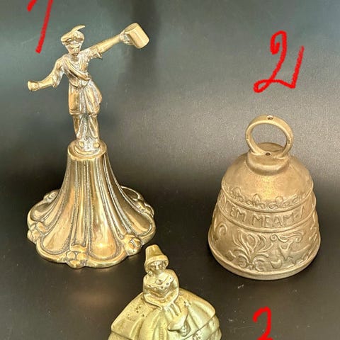 4 - lille bordklokke håndstøbt af massiv messing. Perfekt stand og reneste klang.