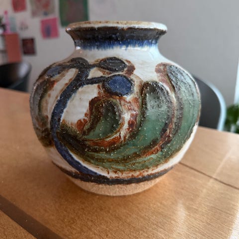 Andre samleobjekter, Stentøjsvase, Spændende stentøjsvase fra bornholmske Søholm. Vasen er cylindrisk med afrundet skulder og optrukken kant ved mundingen. Med stiliseret blomstermotiv og stregornamentik. Væsen bærer nummeret 3740-2 . Den er designet og formgivet af keramikeren Einar Paulsen, der er uddannet 1976 og nu har sit eget værksted i Østermarie på Bornholm. Vasen er signeret. Den er i perfekt stand uden skader. Højden er 13 cm og diameteren midtpå 11,5 cm. Står på Mols men kan gratis leveres i Aarhus og Ebeltoft eller sendes billigt på købers regning