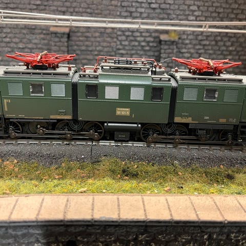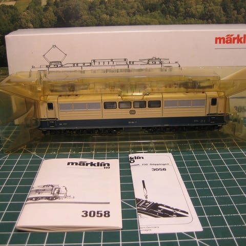 Modeltog, Mærklin 37352, skala H0, Stort el-lok BR 152 med mærklin motiv på siden.