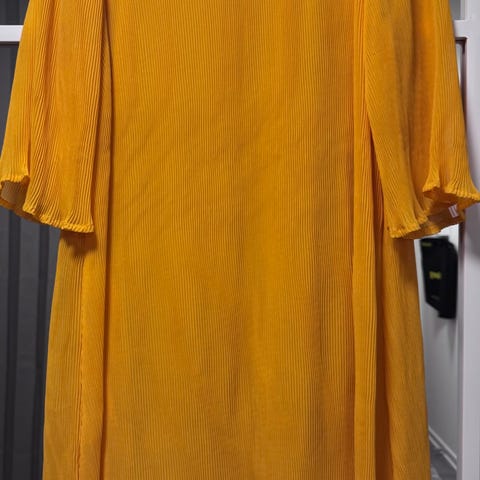 Flot og behagelig kjole til fest og farver. Små puder i ærmerne oppe ved skuldrene og med taljeform. Lynlås på ryggen.