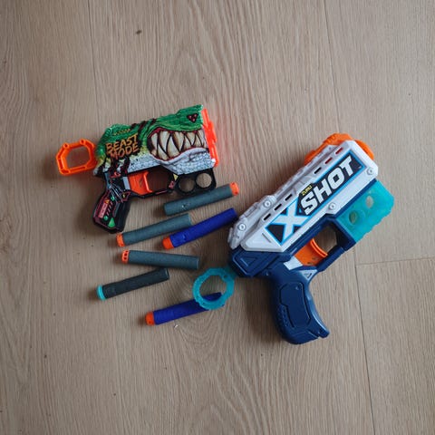 Air Blasters, 2 “look-a-like Nerfguns” af mærket Air Max (købt i ToysRUs) med tilhørende skumpatroner og en NerfGun bæretaske.