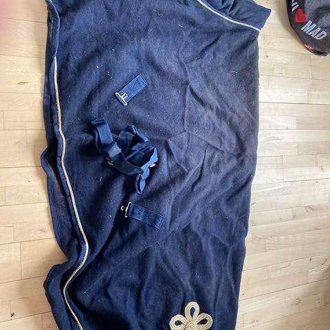 Mørkeblåt ulddækken fra HL Equipment. Str. 135. Gammel "sponsor"- syning på deraf den billige pris + jeg ikke kan se hvor mange % uld der er i. Justerbar front med klap. Kraftig kvalitet. Godt til at suge sved efter ridning.