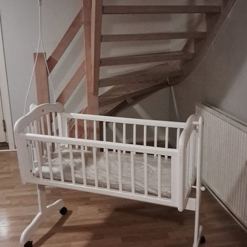 Vugge, Skøn familievugge med madras, flad pude og ægte dundyne. Mål: