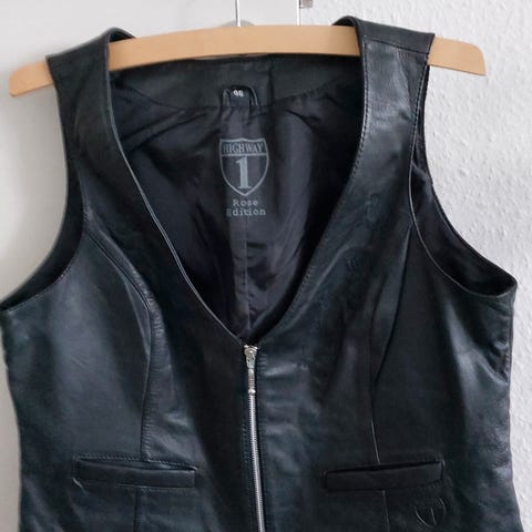 Vest, Lædervest, LaZack, str. L, Sort, Læder, Næsten som ny, Lædervest fra LaZack str. L (passer en str. 38-42). Med knaplukning foran og lynlås rundt om taljen. Brugt få gange, i rigtig pæn stand. Nypris 2.300 kroner. Kan afhentes i Randers eller København eller sendes med posten (køber betaler fragten).