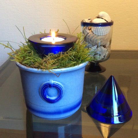 Velholdt urtepotteskjuler/skål eller hvad man vil bruge den til. Dekorativ med en lyskæde. Fra Jette frölich . Metal og stang af messing. Med originalt bånd- ternet- mosgrønt. Og “guldfugl”