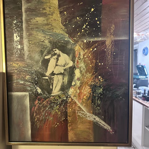 Andet, Ukendt, motiv: Nøgenmotiv, stil: Abstrakt, b: 79 h: 64, Meget farverigt billede. En hurtig streg. Vi er usikre på om det er olie eller anden maling. Vi er ikke enige om motiv. Den ene af os siger kat den anden siger abstrakt nøgenbillede af kvinde i landskab.