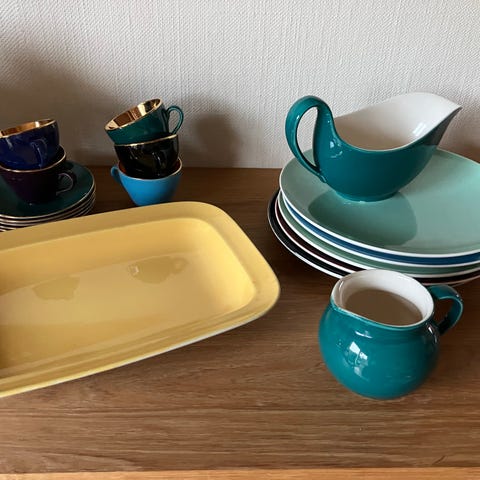Der er tre dybe tallerkner, to æggebægere og den høje kande, der har skår.
