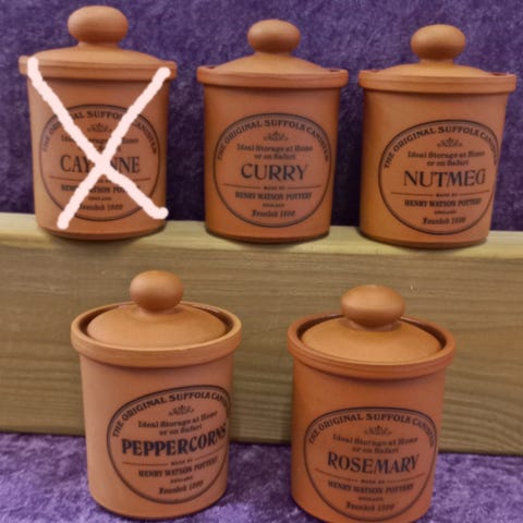 Design Nick Refgaard, Har 4 krydderikrukker til 30kr pr. stk. tilbage, peber, nellike og muskat er solgt