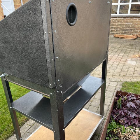 Vandpoleringskabine, Stor, professionel vådblæsningskabine sælges (ikke færdiggjort projekt). Med vogn, som køres ind i den ene ende. Pneumatisk motor for drejning af bord i kabine. Kabine og vogn i rustfast stål. Rustfri kabine (ALT er rustfrit!) på ca. 1400 ltr. (modsvarer ca. Aquanife Neptun), indv. mål: dybde = 1000, bredde = 1200, højde = 1150. Hele konsol, hvorpå emnet står/ligger, køres ind/ud af kabine i højre side, som en vogn med 2 udv. hjul, 2 indv. hjul og udv. lukkebeslag. Der er en kædetrukket drejeskammel med luftmotor for rotation mens der blæses. Denne kan selvfølgelig tages af. Forberedt til aut. vandpåfyldning.