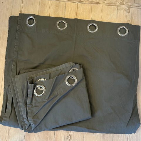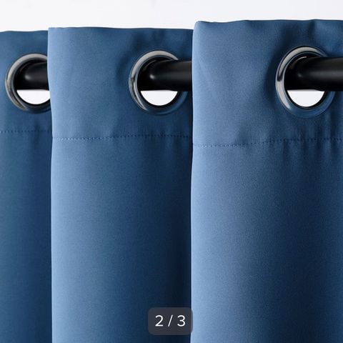 Gardin, b: 140 h: 170, 2 Mørkeblå/sorte gardiner med 8 ringe.Mål: 140x170cm