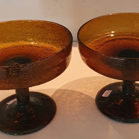 Glas, Champagne skåle/ dessert glas, Vintage, 6 stk helt fantastiske vintage champagne skåle - kan sikkert også bruges til dessert glas - med flotte klare striber i gul , orange og klar blå - måler Ca 7 cm I højden og 9 cm I diameter. Sælges samlet. Kan sendes for 51 kr