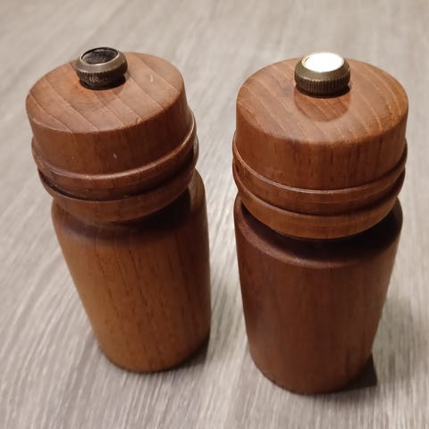 Andet, Salt og peber kværne i teak, Vintage, 20,5 cm høj og 6,5 cm i dia. Peugot peberkværn. Virker perfekt. Lidt patina. Velholdte.