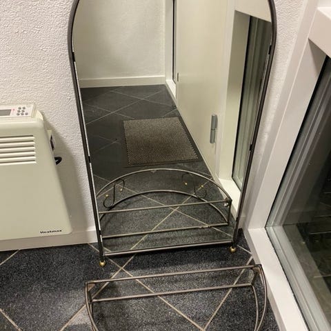 Bord med 2 ophæng, i meget let materiale, har nok været guld engang, men i sølv nu.