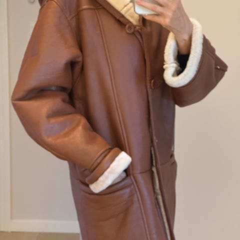 Se sidste billede på Ann. en mini hak i læderet bagpå frakken. Der kan forkomme brugsspor på frakken da den er vintage.