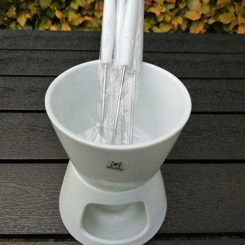 Porcelæn, Chokolade fondue, Menu og Furstenberg, Menu chokolade fondue opvarmes ved hjælp af fyrfadslys, der placeres i koppens nederste del. Overdelen er konstrueret som en termokop, så chokoladen holdes flydende uden at brænde på.