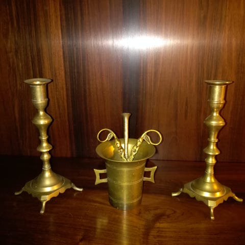Stager morter samt gammelt spejl, messing, fint stilleben på eksempelvis gammel skrivepult. For spejl, stager og morter