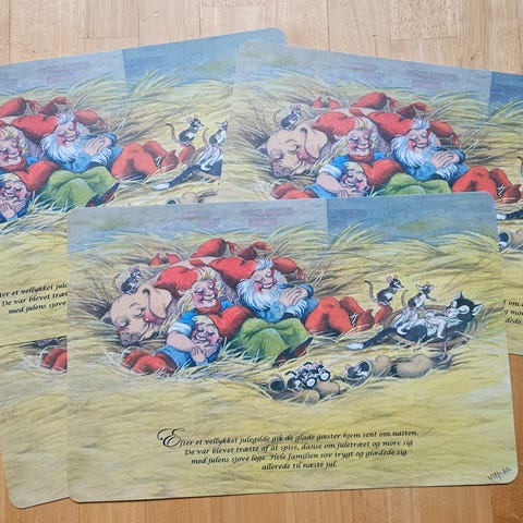 6 dækkeservietter med motiv af Vilhelm Hansen, Søde dækkeservietter med ens motiver. I rigtig fin stand dog kan der være lidt brugsspor. Sælges samlet.
