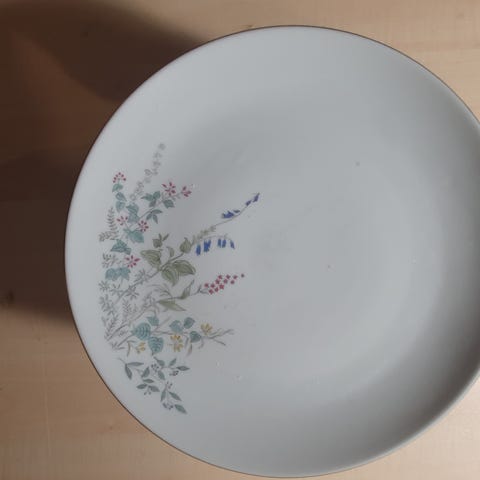 Porcelæn, Kagetallerkener, Fire retro kagetallerkener med guldkant og grå kant. De er uden skår og skader og bagpå står der "Bareuther, Waldwassen, Bavaria".