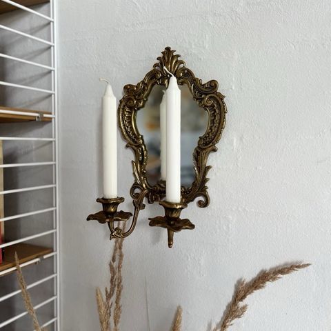 Messing lysestage, gammelt vintage væghængt messingspejl / messingstage med 2 holdere.