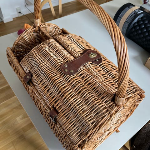 Der er vinoptrækker, bestik og kopper til fire personer til den ene kurv.