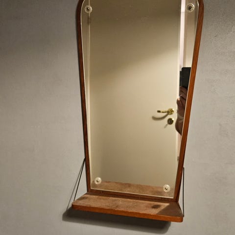 Spejl med teaktræs ramme, hylde og lampe