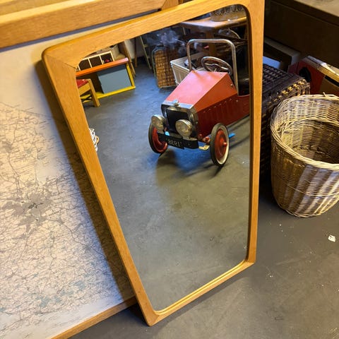 Retro spejl med teaktræs ramme, med hylde og lampe. Formegentligt fra 60’erne