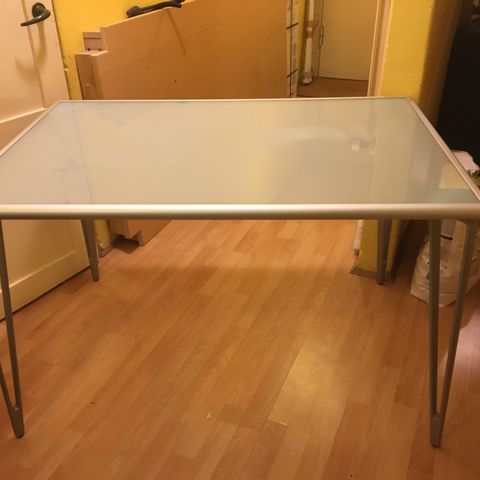 Skrive-/computerbord, b: 120 d: 60 h: 75, Meget fint skrive- computernørd, som har stået i et sommerhus og derfor ikke været brugt ret meget. Bordpladen er i matteret glas og stellet er i gråt metal.