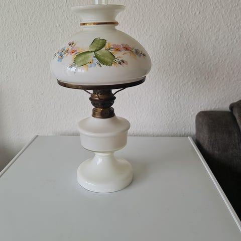Fin, gammel petroleumslampe med grøn beholder og klart glas mærket Texa Saevedalen. Måler 37 cm incl. glasset i højden.