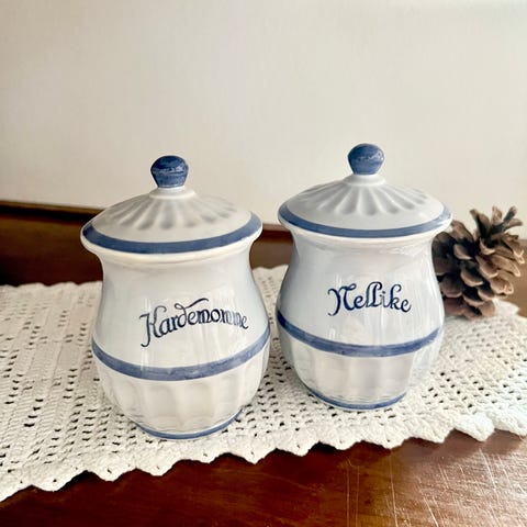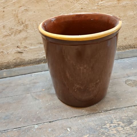 Krukker i keramik, 2 stk håndlavede - husker ikke kunstner. Fine til krydderurter eller gran til jul. Helt intakte. Med blank glasur indvendigt. Beige farver med pudderfarvet inderside.
