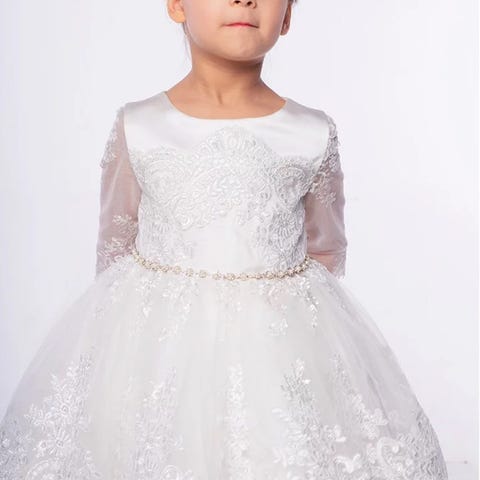 Kjole, Hvid fest kjole, ..., str. 134, Fin hvid tyl kjole med lyserød bælte til piger. Fra udlandet. Der står ikke størrelse på den. Talje mål kan man se på et af billederne og den er ca. 80 cm lang. Den vil passe piger på ca. 8/ 9 år. Indvendigt er kjolen lidt ødelgat. Man kan ikke se det når man har den på. Den er brugt 2 til 3 gange.