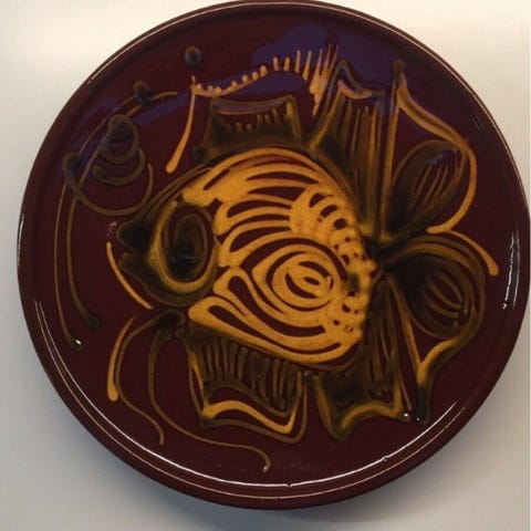 Platte (kan hænges på væg) eller smykkeskål er Ø 18 cm. I hel og fin stand.