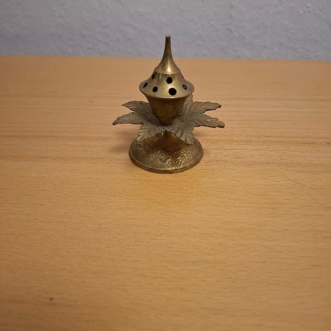 4 - antik røgelses opsats håndstøbt af massiv messing. Pærerformet med håndtag og kors på toppen. Fin stand. H 17,5 cm.