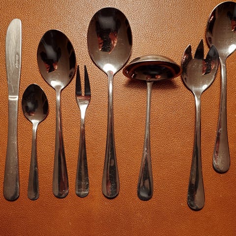 Rustfrit stål, Bestik, knive/ teske, Horisont/Aida, Opøser/serveringsske,2x teske i Horisont/ Aida bestik
