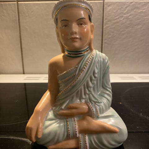 Orientalsk rytter., Ukendt, motiv: Rytter til hest., Flot figur med mand på en hest med 4 væbnere på en platform af træ. Købt i Vietnam for godt 20 år siden. Højden er 28,5 cm, længden 23 cm og dybden 10 cm.