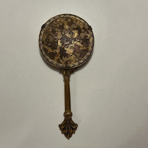 Spejl, Messing, 100 år gl., Fineste lille ovale spejl i messing - tekst Hansa Ges Gecht - tror jeg