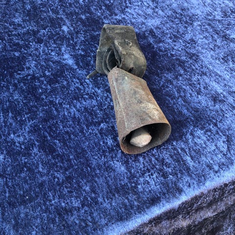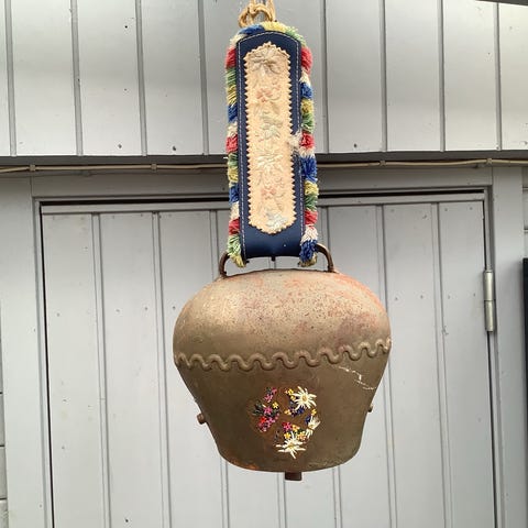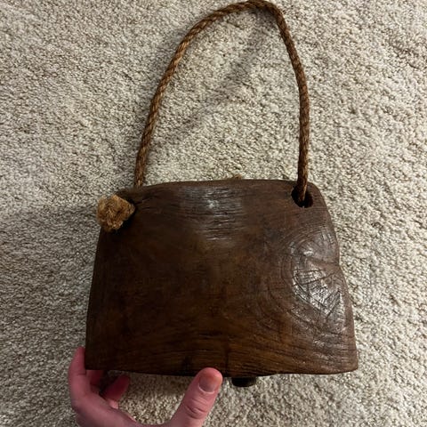 Skøn antik kobjælde i kobber med træ-klokkehammer. I læderrem. Kan bruges som "dørklokke".
