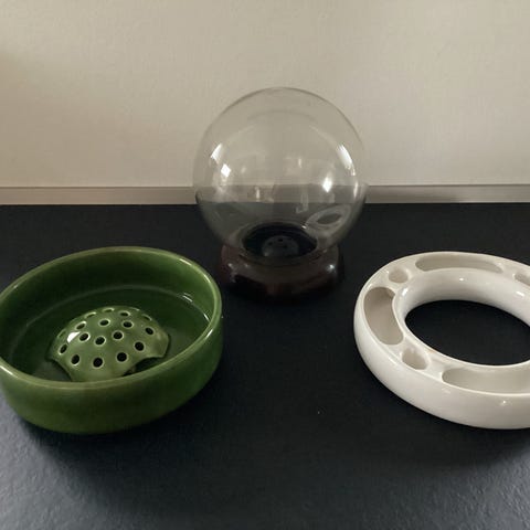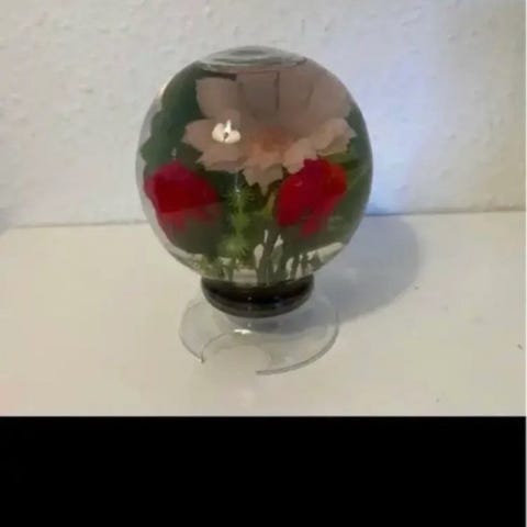 Gl Spåkugle med vand og plastikblomster, Gammel. Kugle med vand og kunstige blomster