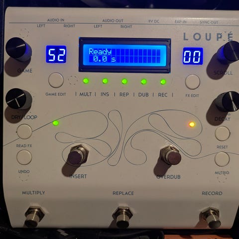 A 20-second analog phrase-sampling looper with very low fidelity, frequency response that cuts off at 2.6 kHz, brick-wall compression, hiss, distortion, and a warped-record vibrato feature that makes your guitar sound like an ancient radio transmission, but your direct guitar sounds especially sparkly.