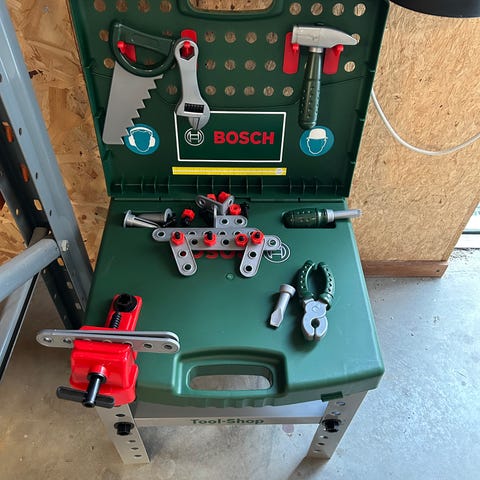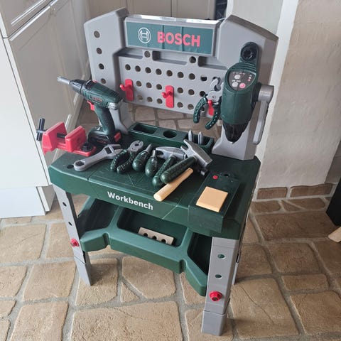 Værktøjsbænk, Værktøjsbænk med ekstra værktøj, Tool tech, Værktøjsbænk med 9 stykker værktøj, originale bore/skruemaskine kører noget langsomt, 3 stk. plastik træstykker, 10 søm, 14 skruer, 24 møtrikker og 12 knager. (Normalpris 699 kr.) Pris 300 kr.