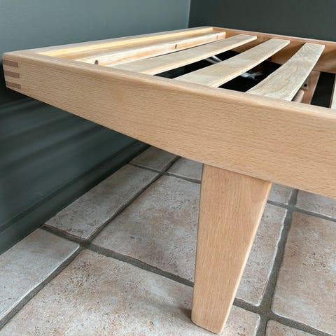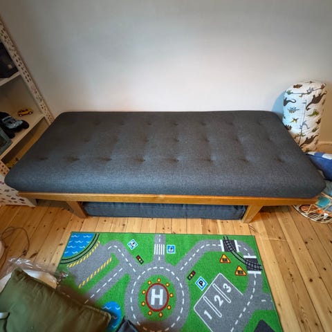 Poul M. Volther, Daybed, Fdb, Daybed, briks, sofa, Original fin daybed / briks lavet af Poul M. Volter med stempel og klistermærke fra FDB, som vi har brugt som sofa siden februar. Derfor har vi fået lavet skrå skumryg og puder til i februar 2023, som jeg selv har syet betræk i i gammelrosafarvet fløjl til. Under fløjlbetrækket er der på madrassen et mørkeblåt betræk på, som er lavet professionelt hos møbelpolstre, der kan tages af og vaskes for ca. to år siden, men som ikke passede ind i vores nye lejlighed. På det sidste billede kan man se farven på det mørkeblå stof, som er på madrassen.