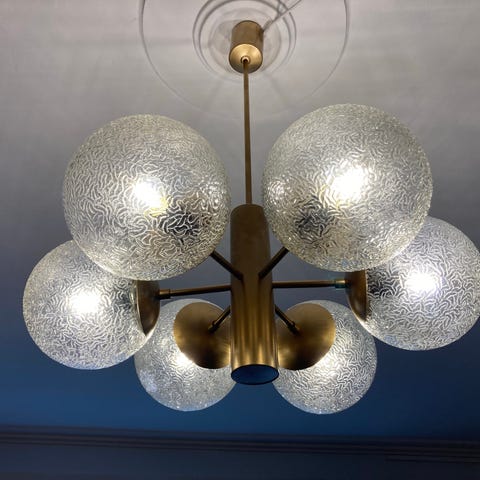 Søgeord: Sputnik, lysekrone, lampe, loftlampe, messing, arme, antik, gammel, eksklusiv, fransk.